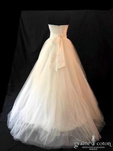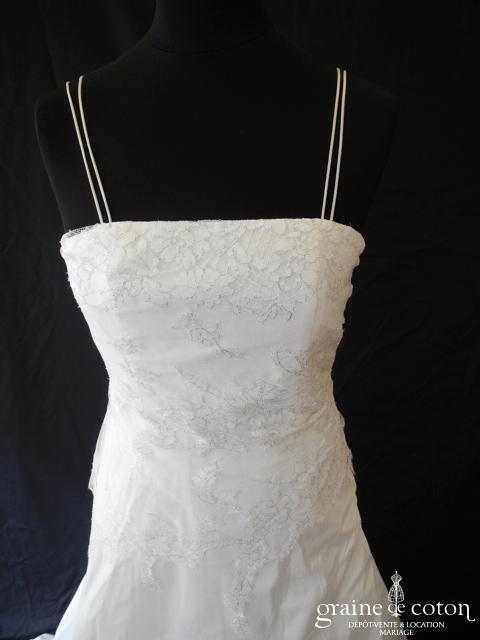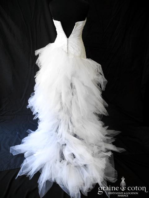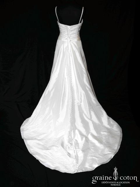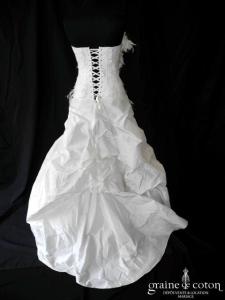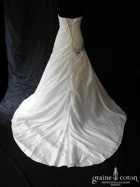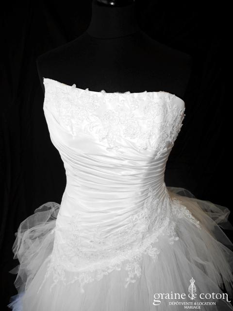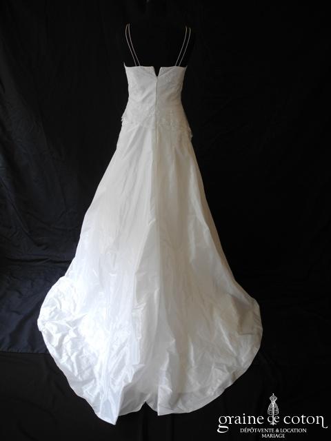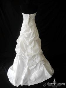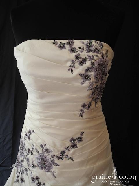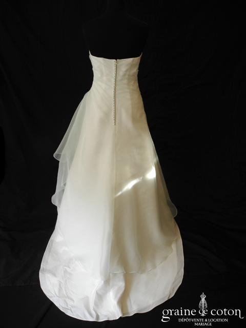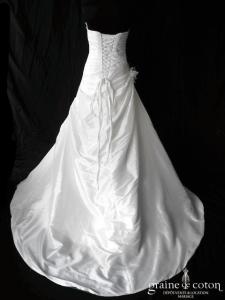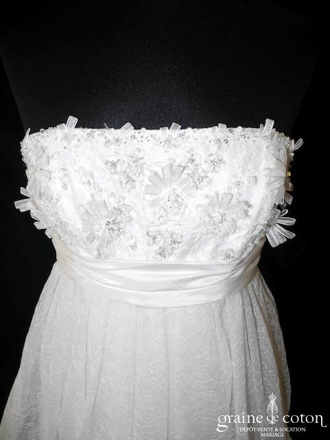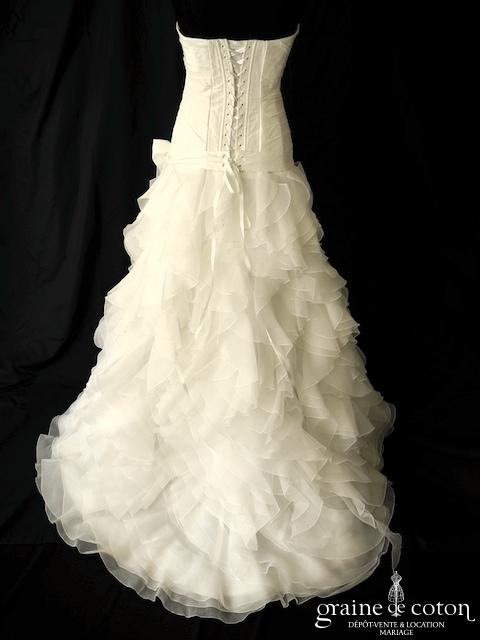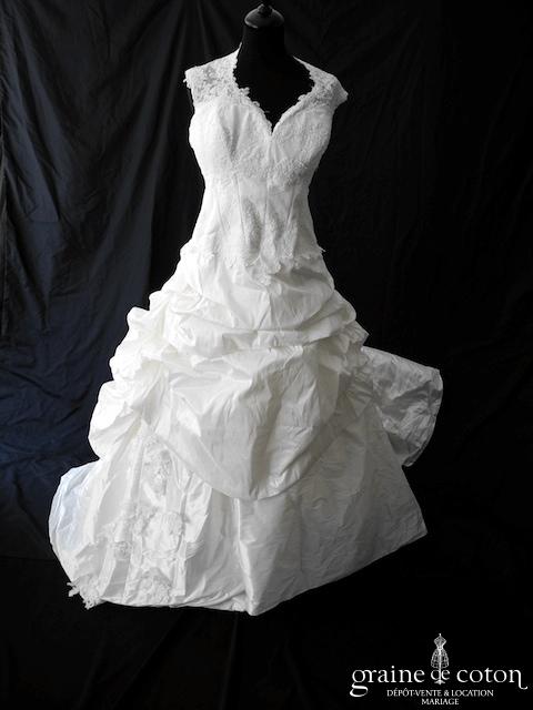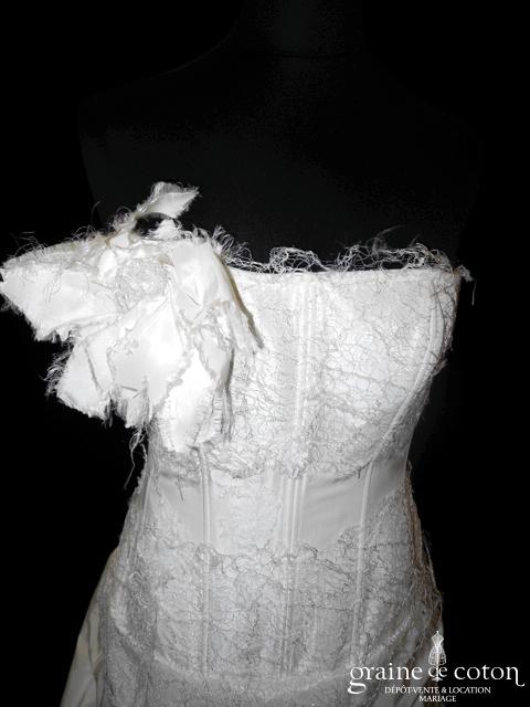 Robe une pièce drapée en taffetas plissé ivoire : bustier forme coeur, drapé à la taille. Jupe fourreau s’évasant sur un large volant de taffetas plissé, orné de grosses fleurs …