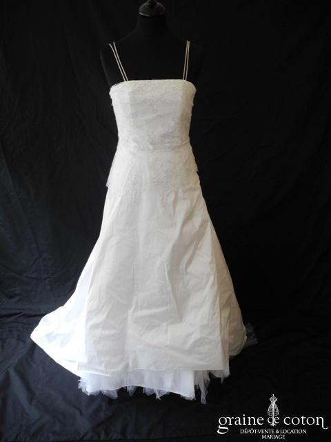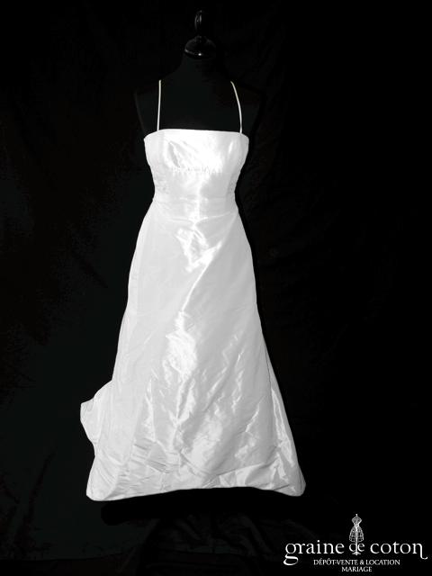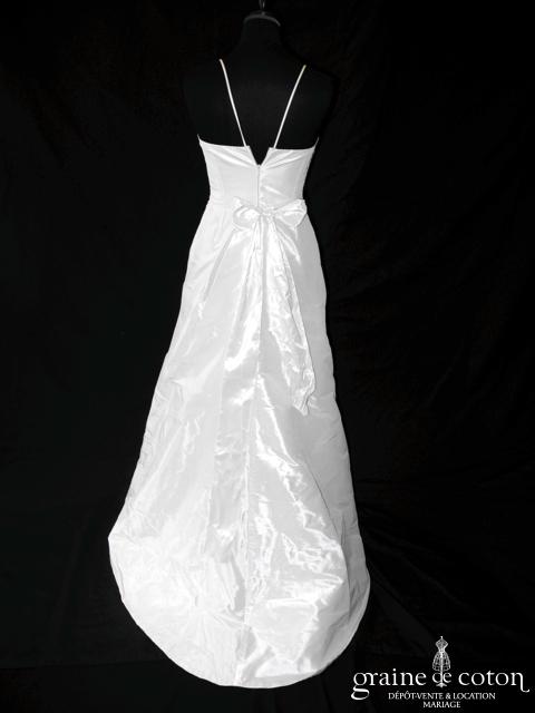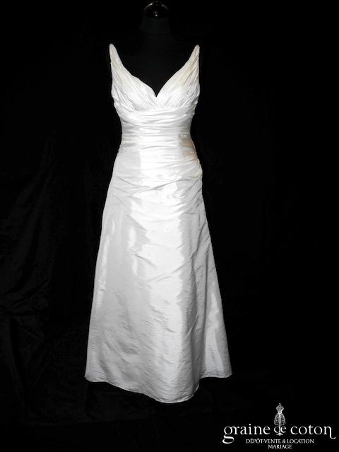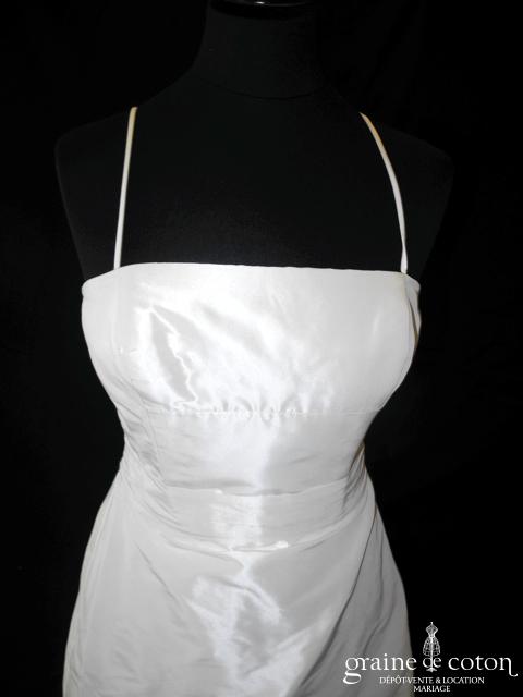 Robe une pièce en taffetas iboire : bustier coeur tout en bandes, droite au genou. Idéale pour une cérémonie civile.