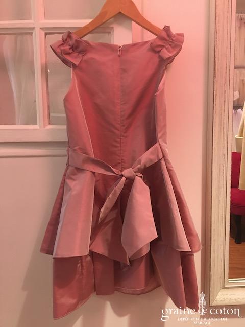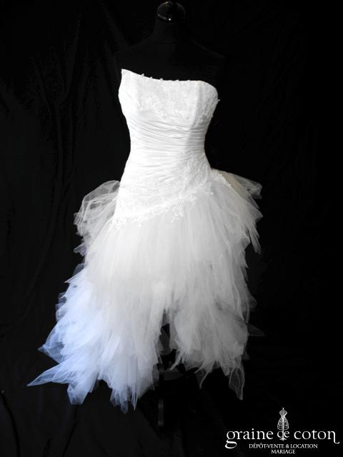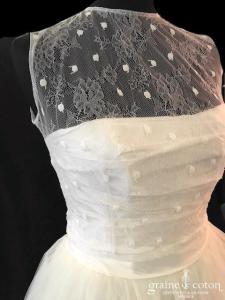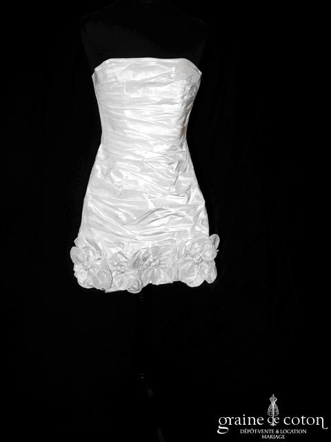 Robe courte une pièce : bustier en taffetas drapé avec tour de cou, fleur en tissu à la taille. jupe courte s’ouvrant sur un jupon en mouchoirs de tulle. Idéale …