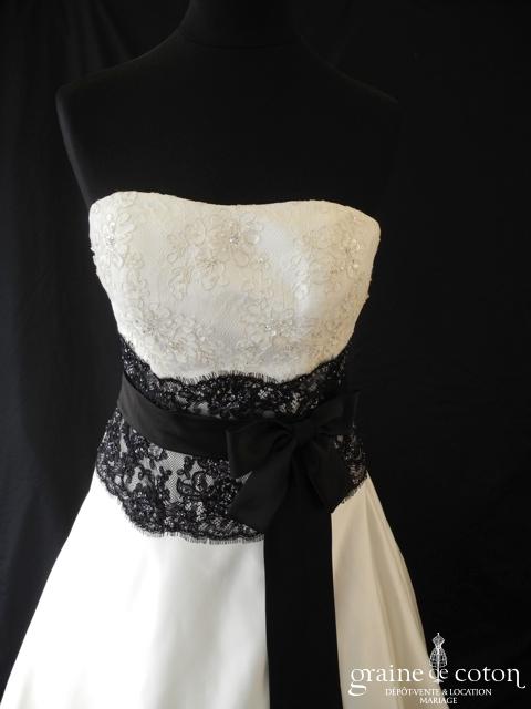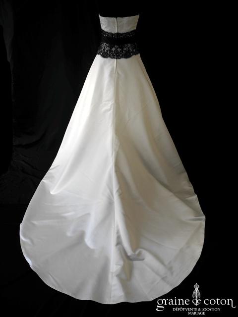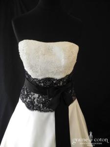 Robe une pièce en satin blanc : bustier coeur recouvert de dentelle avec large ceinture de dentelle et satin noir à la taille. Jupe évasée forme trapèze tout en satin …
