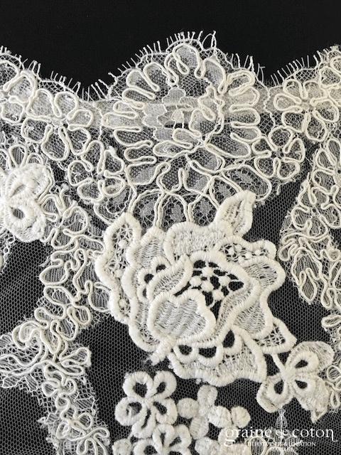 Robe une pièce en tulle ivoire clair : bustier coeur drapé, jupe patineuse taille haute largement évasée, courte au genou. Sur traîne amovible. Fraîche et festive !