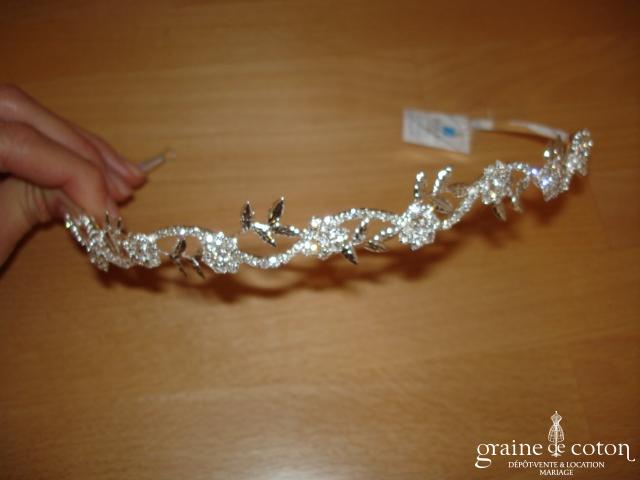 Diadème fin avec strass en forme de fleurs et feuilles argentées. S’attache à la coiffure avec de petits pics à chignon.