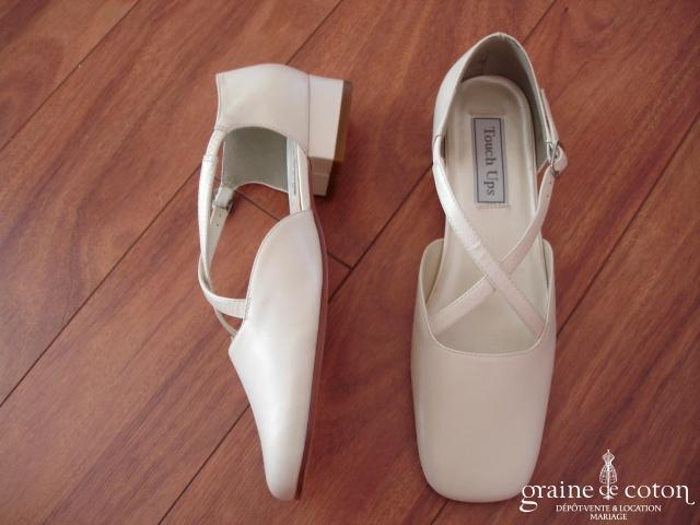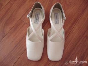 Escarpins en cuir ivoire légèrement nacré, bout carré, lanières croisées sur le devant, talon de 2,5 cm.