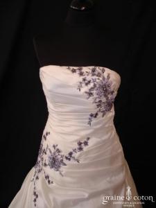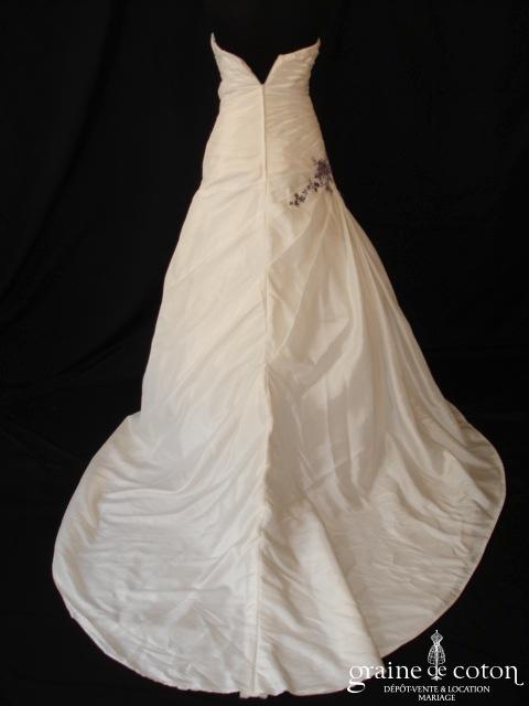 Dépôt du modèle « Noces de vermeille » de Pronuptia, en taffetas drapé ivoire brodé de fleurs violettes. Très beau contraste, élégante et seyante. Dos lacé pour un confort optimal ;o) Taille …