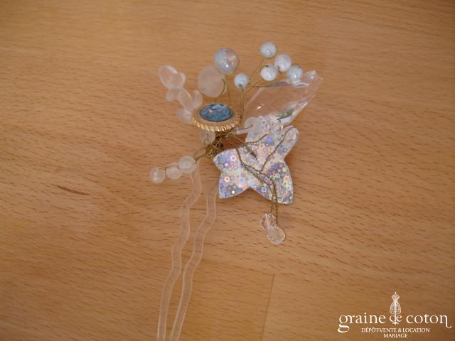 Pic à chignon perles bleues et feuilles en pâte de verre