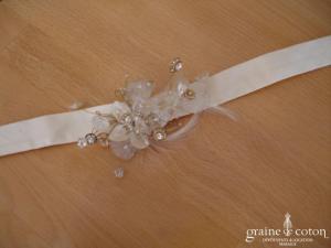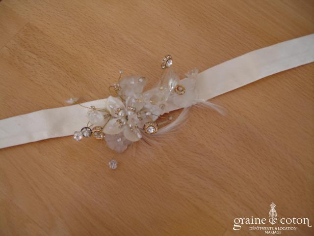Tour de cou en soie ivoire, avec fleurs en pâte de verre, strass et plumes.