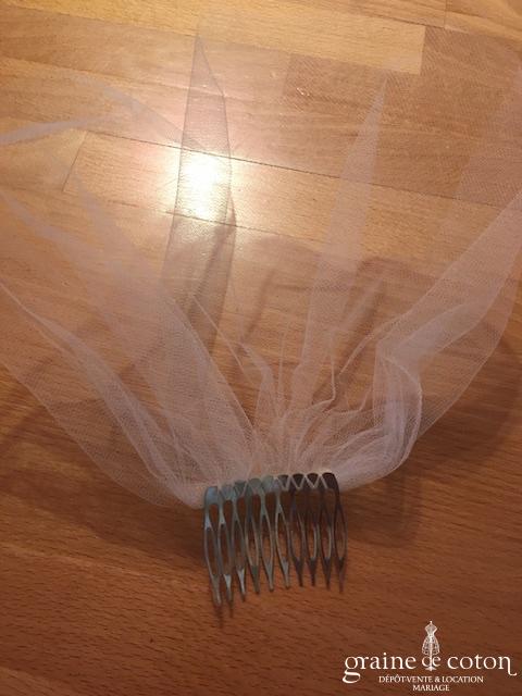 Voilette attachée à une grosse fleur en tissu ivoire, centre de la fleur strassé discrètement : le tout est monté sur peigne pour une fixation aisée.