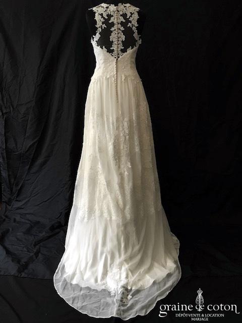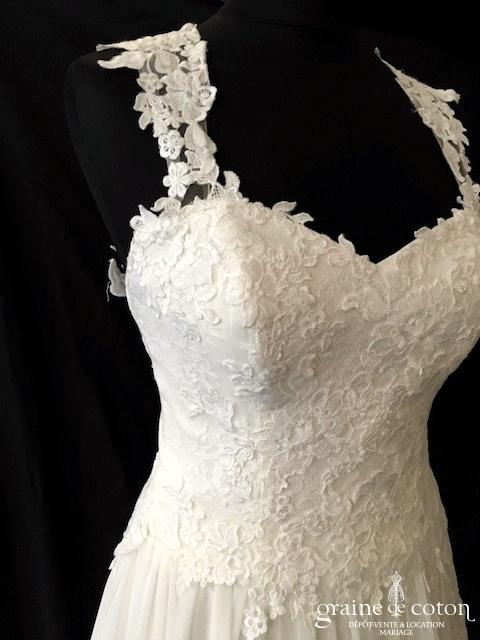 Robe une pièce en mousseline ivoire clair : bustier en dentelle coeur avec larges bretelles de guipure, dos en tulle chair avec effet tatouage de dentelle, entièrement boutonné. Jupe fluide …